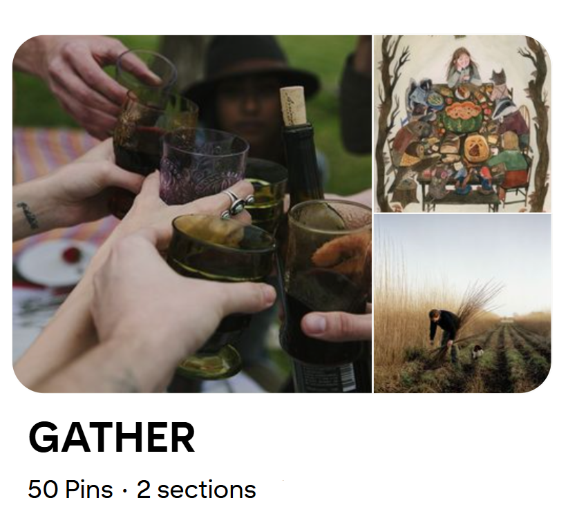 We’d love to see art and photography showing friends and family gathered around the table, baskets laden with the season’s produce, and memories made in cozy candlelit ambience. Photographers might capture the texture of a ripe fig or a sheaf of wheat, the movement of a bonfire’s flames, or a favorite moment in the making. Artists could paint scenes of home that incorporate the colors of autumn produce, armfuls of late-summer wildflowers, and details often missed at a gathering, such as a pie coming out of the oven or stacks of board games ready to be played. In design, we’d love to see fonts inspired by vintage grocery labels, swirling natural textures, and warm autumn colors countered with subtle, muted pastels.